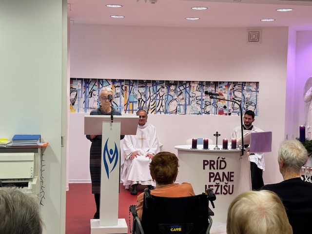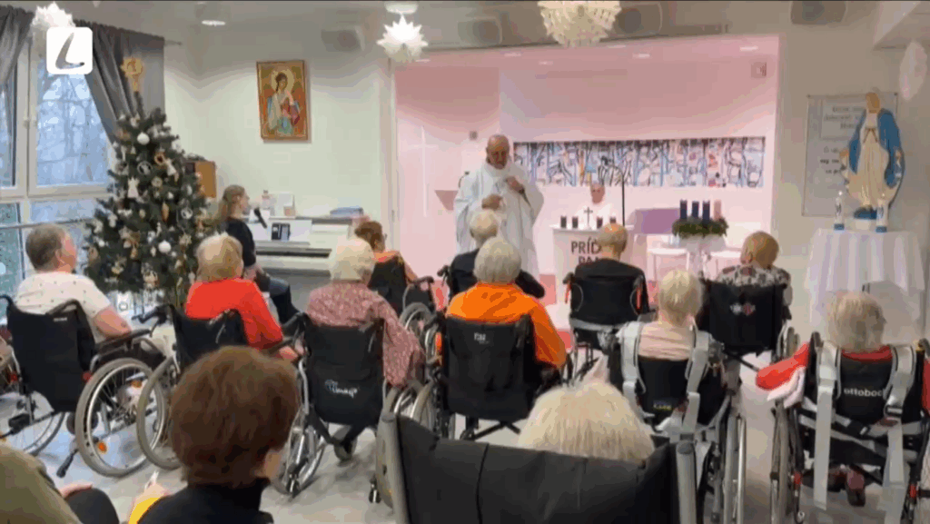 Otec Benjamín Kostnáč (riaditeľ klubu priateľov Tv Lux) slávil sv. omšu pre našich pacientov a klientov spolu s otcom Jakubom z Opus Dei, ktorý ku nám prichádza každú stredu. V homílií nás povzbudil, že v bolesti a v chorobe nie sme sami a jarmo, ktoré na nás dolieha nesie Kristus spolu s nami. Otec Benjamín pre Tv Lux zdieľal svedectvo prijatia viery našej pacientky v hospici. Na záver sv. omše hoci v adventnom čase sme si zaspievali koledy.