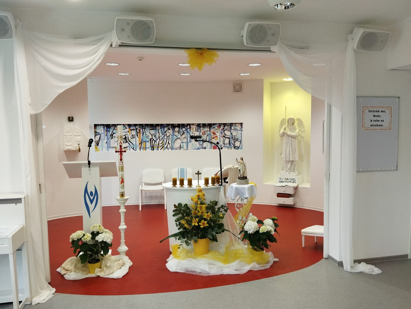 Klienti a pacienti Domu RAFAEL zo všetkých oddelení boli pozvaní na krížovú cestu na Veľký piatok o jedenástej hodine, aby spoločne rozjímali nad Pánovým umučením a uctili si v tento deň sv. Kríž. Z pastoračných a prevádzkových dôvodov sme nemohli sláviť v našom Dome Veľkonočnú vigíliu a sv. omšu z Veľkonočnej nedele, ale práve na Veľkonočný pondelok (vo veľkonočnej oktáve), sme oslávili Pánovo zmŕtvychvstanie – zmysel našej viery a nášho života. Kaplnka sa zaodela do bielej a zlatej farby, bola ozdobená kvetmi, symbolom paškálu, pridaním sviec i sochou zmŕtvychvstalého. Tento pohľad hneď vzbudil slávnostnú atmosféru plnú radosti. Na záver sv. omše sme sa klientami a pacientami pozdravili známym a ľudovým pozdravom: „Christos voskrese!“ s odpoveďou „Voistinu voskrese“. („Kristus vstal z mŕtvych!“, na čo druhá strana odpovedá: „Naozaj vstal z mŕtvych“) Aleluja.